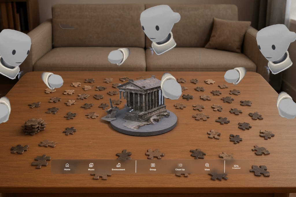 A viewpoint where at least four players can sit around a table, mimicking real-life puzzle building.