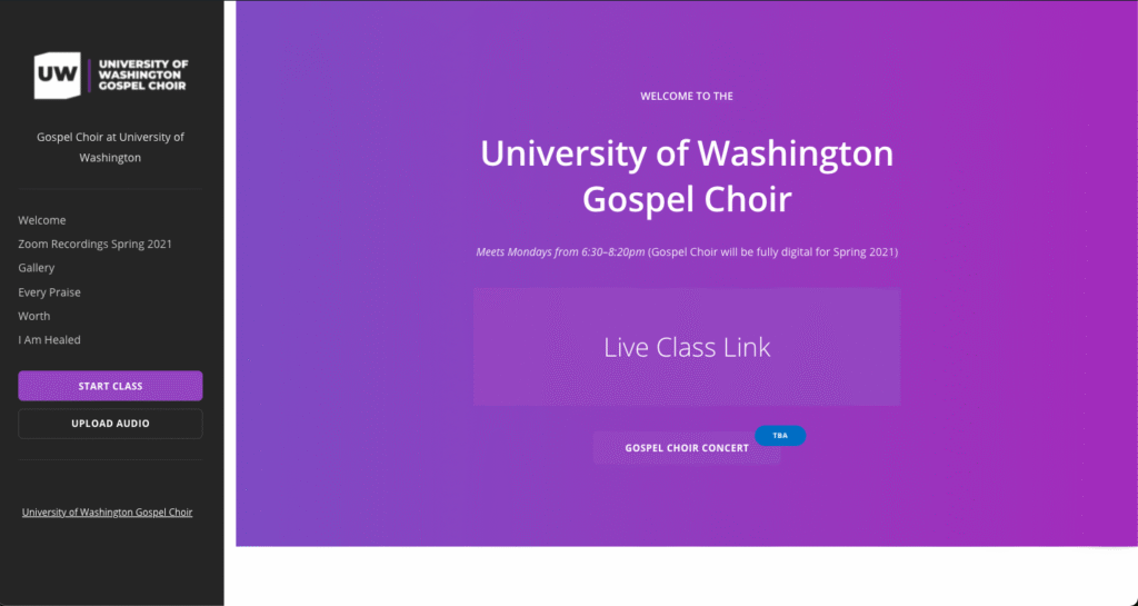 During the COVID-19 pandemic, many artistic departments at the University of Washington sought ways to conduct classes while adhering to health and safety restrictions. The choir department, in particular, required a platform to facilitate their weekly sessions. As the Lead Product Designer, I was responsible for creating a solution that enabled the sharing of audio files and instructions with students, allowed students to upload their MP3/MP4 files, and supported the broadcasting of end-of-quarter concerts.